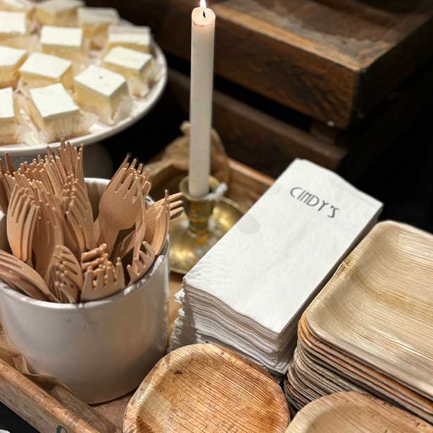 אנחנו בסינדיז נדאג לאירוע שלכם. החל ממפות ומפיות בצבעים לפי בחירה, סכו”ם מהודר, שולחנות וכיסאות ערוכים, צלחות מעוצבות, כלי הגשה ועריכה מהודרים כדי שהאירוע יהיה בדיוק כמו שחלמתם עליו.